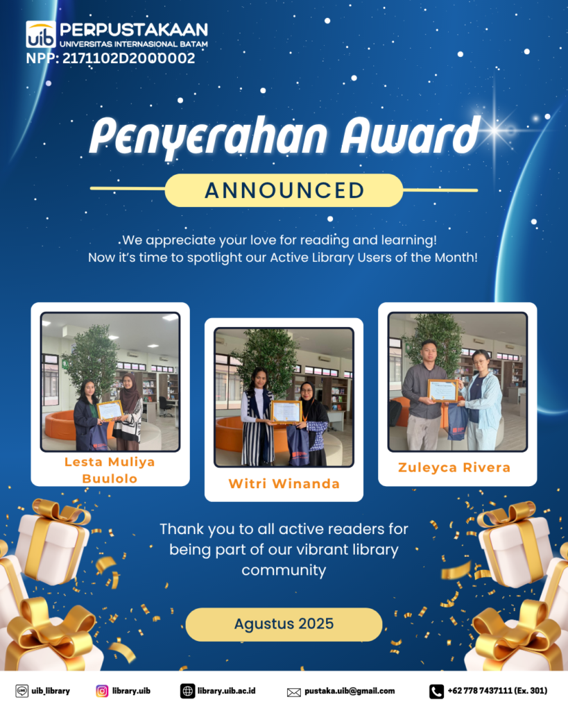 Perpustakaan Universitas Internasional Batam mengucapkan selamat kepada tiga pemustaka aktif terbaik bulan Agustus 2025. Penghargaan ini diberikan sebagai bentuk apresiasi atas antusiasme dan konsistensi dalam memanfaatkan fasilitas serta koleksi perpustakaan. Program Pemustaka Award merupakan inisiatif Perpustakaan UIB untuk meningkatkan semangat literasi, budaya membaca, serta optimalisasi layanan yang tersedia. Setiap bulan, perpustakaan memberikan penghargaan kepada pemustaka […]