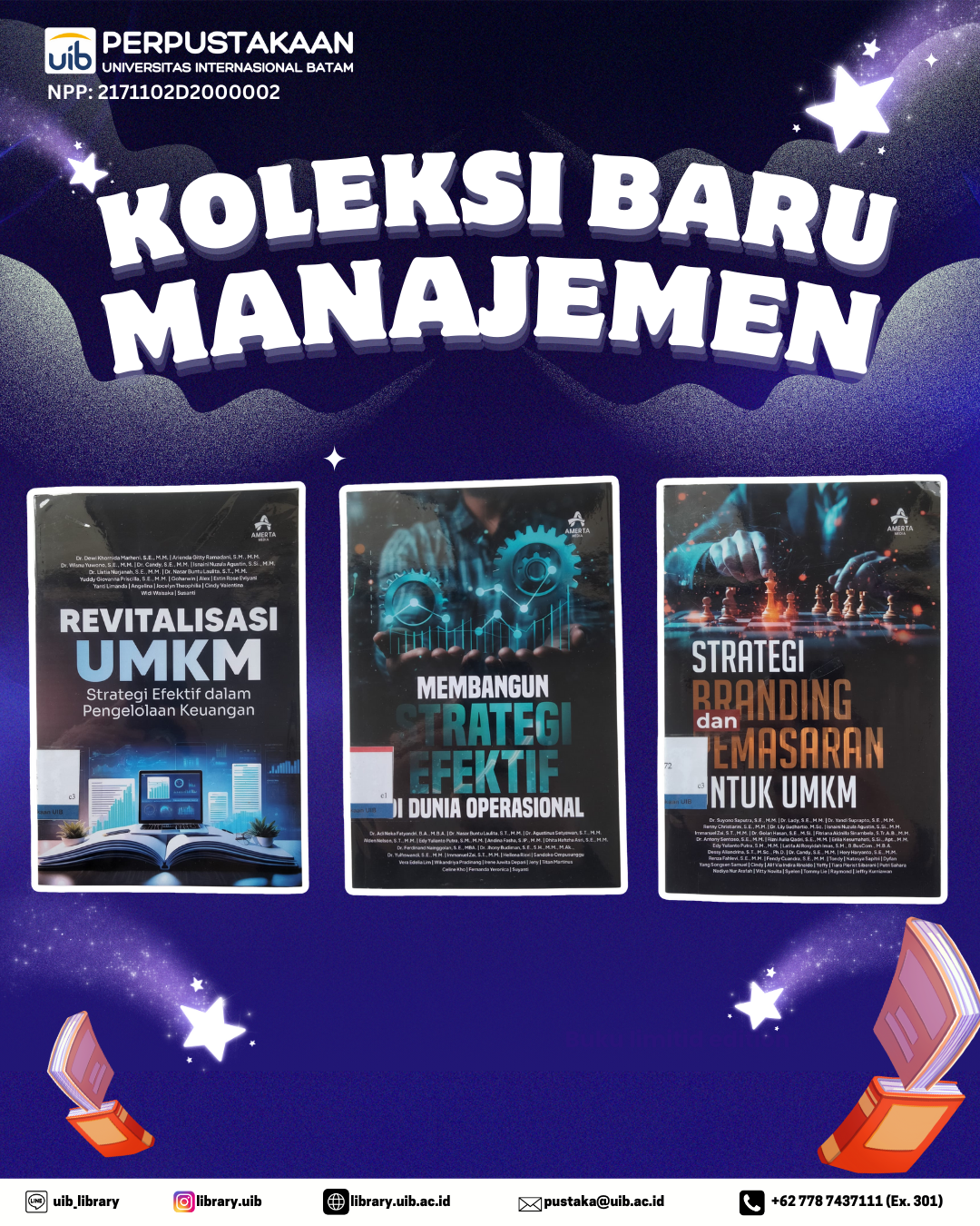 Perpustakaan Universitas Internasional Batam kembali menambahkan koleksi terbaru untuk mendukung kebutuhan literatur sivitas akademika, khususnya mahasiswa Program Studi Manajemen. Tiga buku baru ini merupakan hasil kolaborasi dosen dan mahasiswa UIB, yang menunjukkan komitmen institusi dalam mendorong karya ilmiah dan kontribusi akademik di bidang manajemen, UMKM, operasional, serta pemasaran.