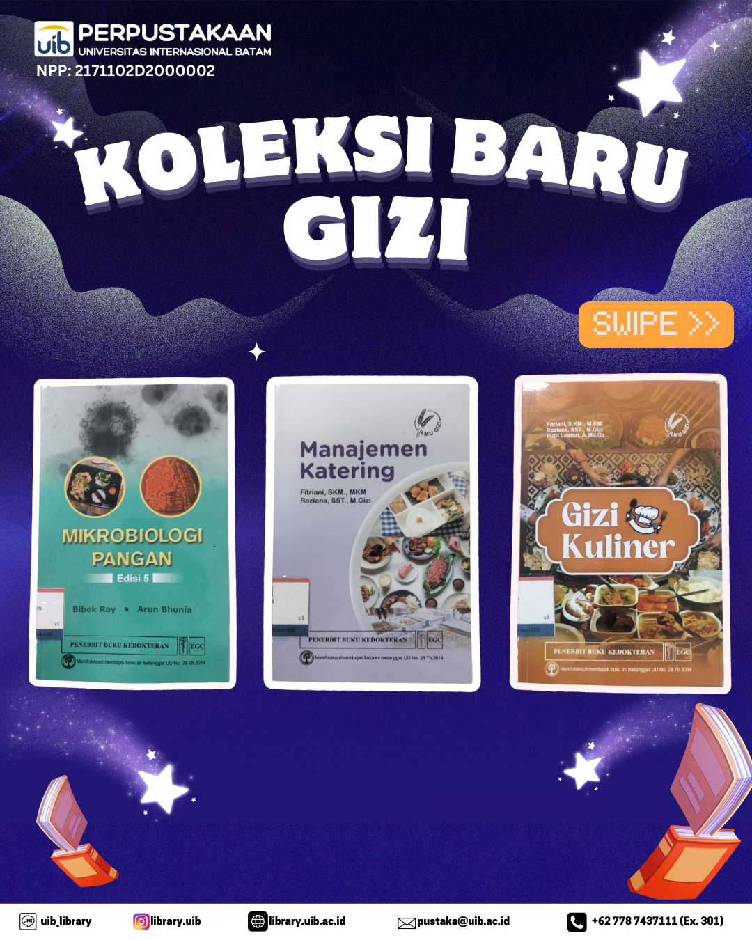 Perpustakaan Universitas Internasional Batam kembali menghadirkan tiga buku terbaru yang menjadi rujukan penting bagi mahasiswa Program Studi Gizi. Koleksi ini dirancang untuk mendukung pemahaman akademik sekaligus memperkaya wawasan praktis dalam bidang gizi, keamanan pangan, kuliner sehat, dan manajemen layanan makanan.
