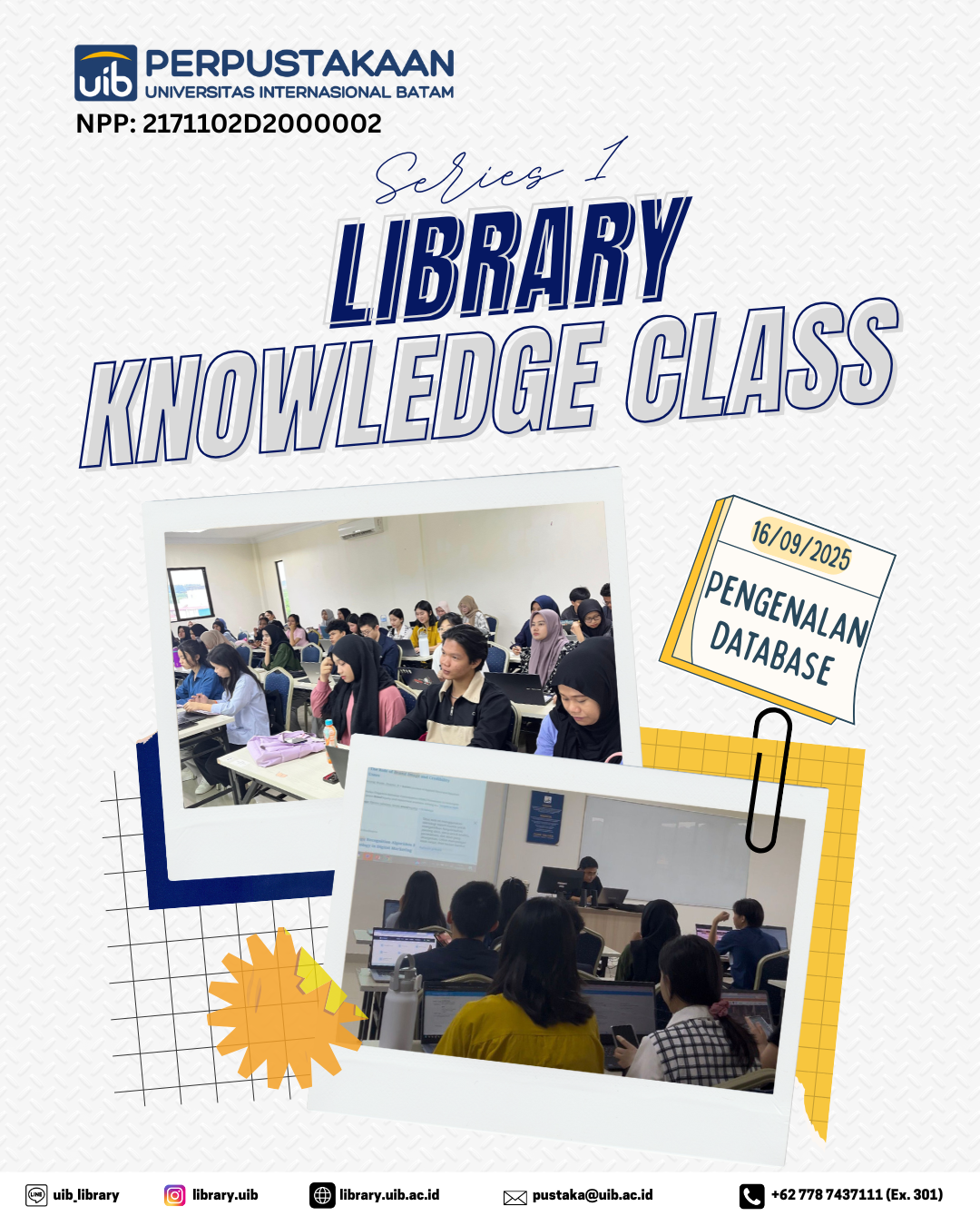 Perpustakaan Universitas Internasional Batam (UIB) melaksanakan kegiatan Library Knowledge Class (LKC) Series 1 pada [tanggal kegiatan] sebagai bagian dari program pengenalan literasi informasi bagi mahasiswa baru.