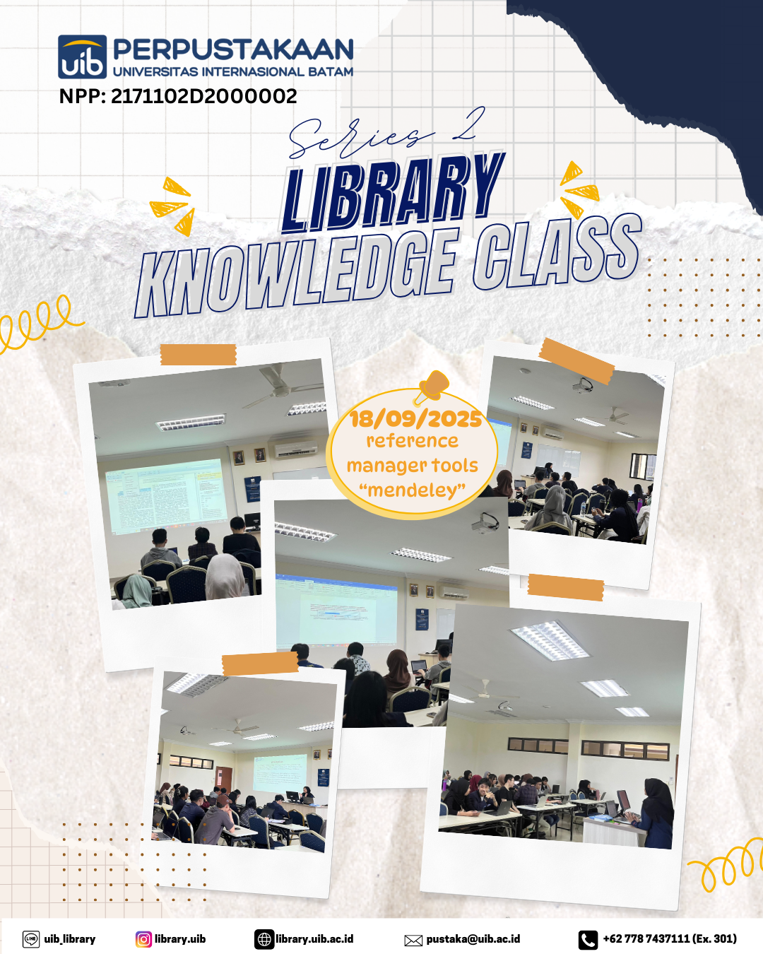 Selasa, 16 September 2025, Perpustakaan Universitas Internasional Batam (UIB) kembali melanjutkan rangkaian kegiatan Library Knowledge Class (LKC) Series 2. Pada kesempatan ini, materi yang dibawakan berfokus pada penggunaan Reference Manager Tools Mendeley sebagai salah satu perangkat penting dalam pengelolaan referensi akademik. Kegiatan ini diikuti oleh 63 mahasiswa baru dari Program Sarjana Akuntansi, Teknik Sipil, Arsitektur, Manajemen, Sistem Informasi, Hukum, Pariwisata, Gizi, Teknologi Informasi, serta Magister Hukum.