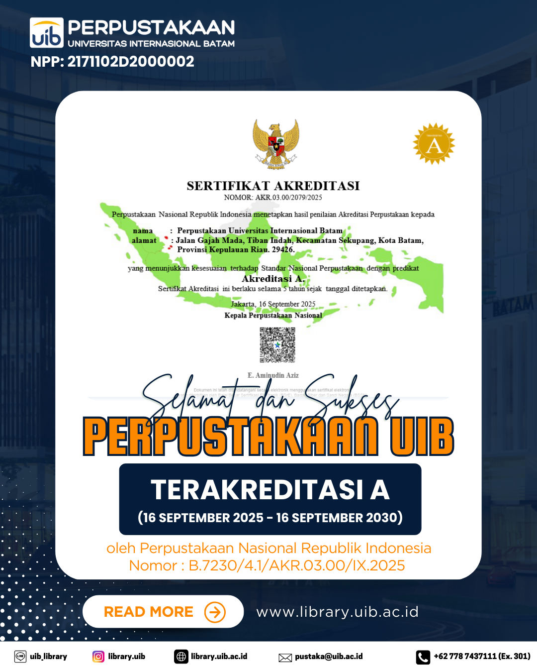 Perpustakaan Universitas Internasional Batam (UIB) kembali menorehkan capaian membanggakan dengan meraih Akreditasi A dari Perpustakaan Nasional Republik Indonesia. Pencapaian ini menjadi bukti nyata komitmen Perpustakaan UIB dalam menyelenggarakan layanan perpustakaan yang bermutu, profesional, dan sesuai dengan Standar Nasional Perpustakaan.