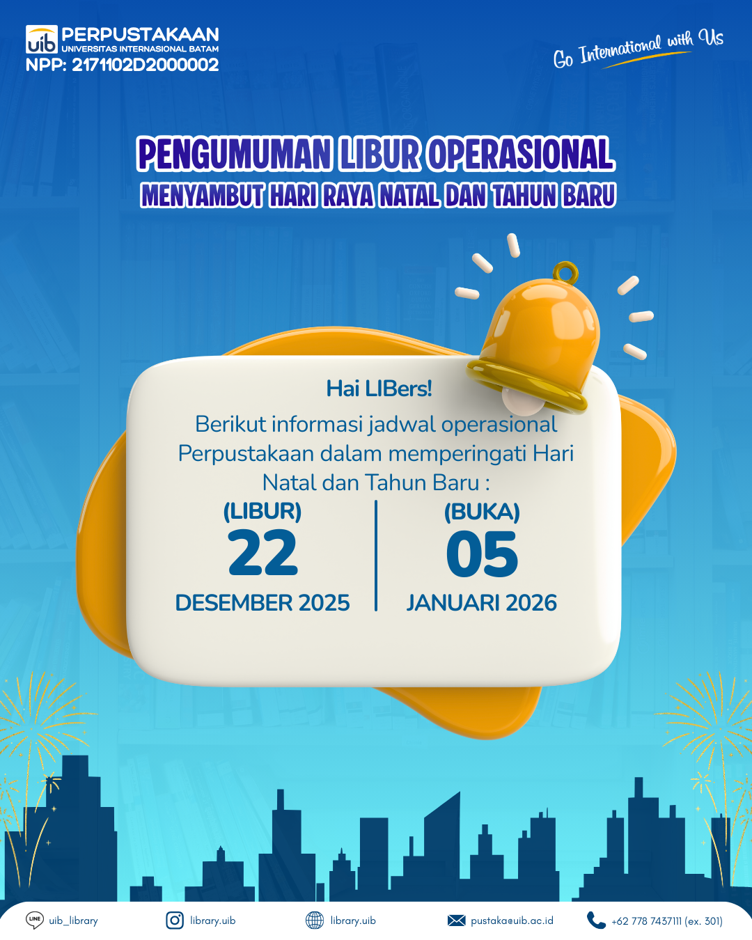 Perpustakaan Universitas Internasional Batam (UIB) menyampaikan pengumuman kepada seluruh sivitas akademika, khususnya mahasiswa, dosen, dan tenaga kependidikan, terkait penyesuaian jadwal operasional layanan perpustakaan dalam rangka memperingati Hari Raya Natal dan Tahun Baru.