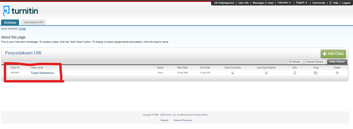 - Tampilan turnitin setelah log in, Pemustaka klik folder/class name Tugas Mahasiswa