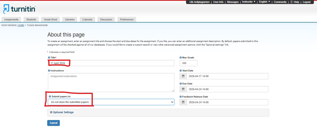 4. Selanjutnya isi title sesuai dengan tanggal melakukan pengajuan cek turnitin, pastikan keterangan pada submit papers to adalah “Do not store the submitted pappers”, dan klik submit.